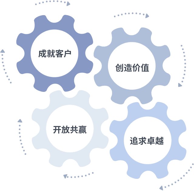成就客户是一切决策的出发点,,创造价值是衡量所有工作的标准,,,,追求卓越是我们做事做人的态度,,开放共赢是我们的格局也是最终的结果。。。。价值观的齿轮环环相扣,,,推动着组织里的每个人不断向前。。。